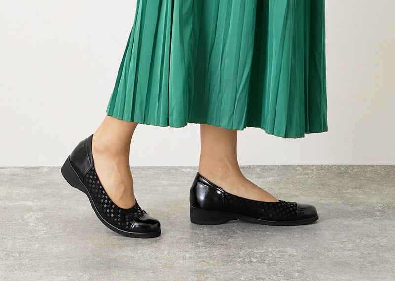 光沢感のある革とエナメルを組み合わせたこのバレエシューズは、コーディネートのアクセントに。つま先と踵に施されたエナメルが、全体を引き締めており、装いに華やかさをプラスします。お出掛けやデイリーユースにもぴったりです。